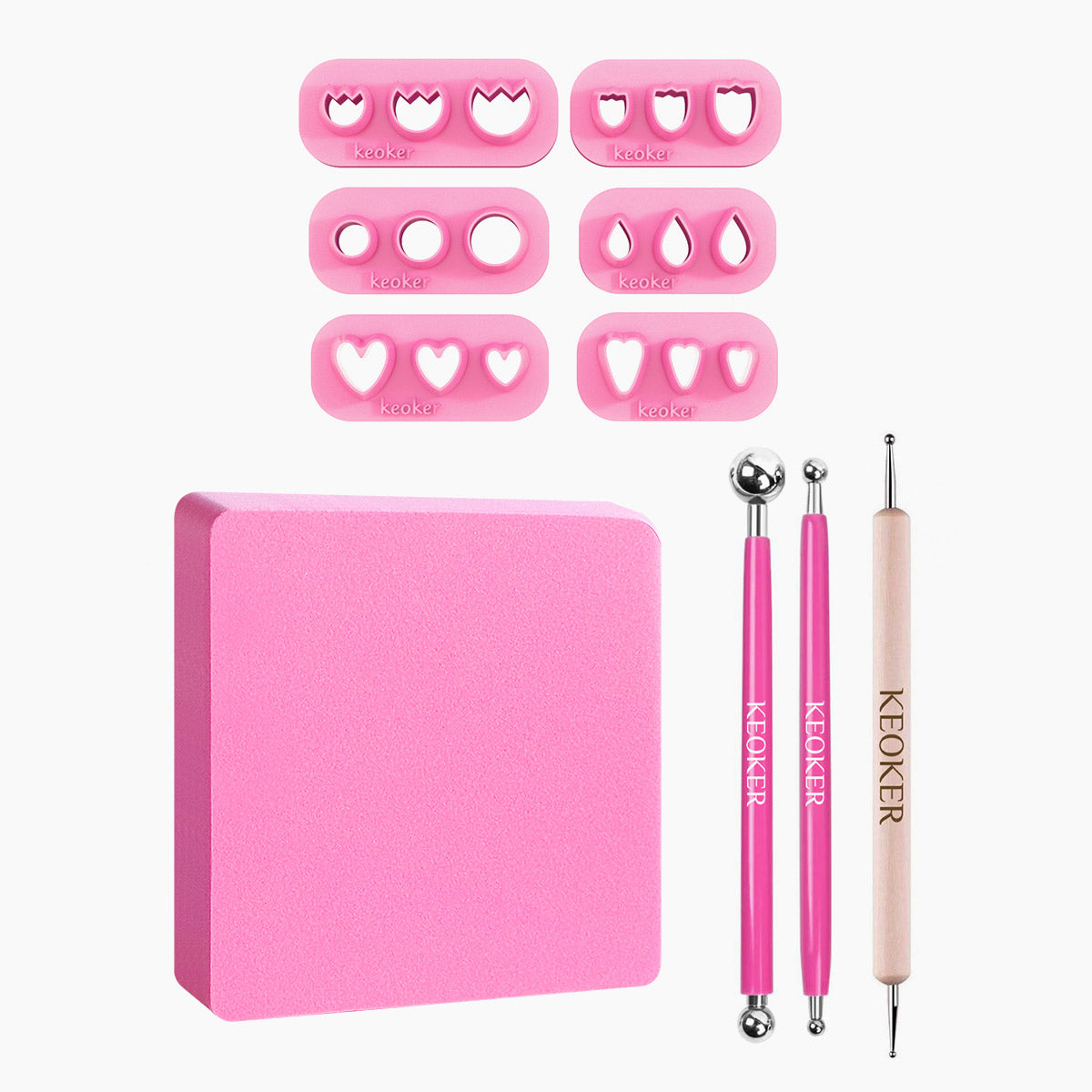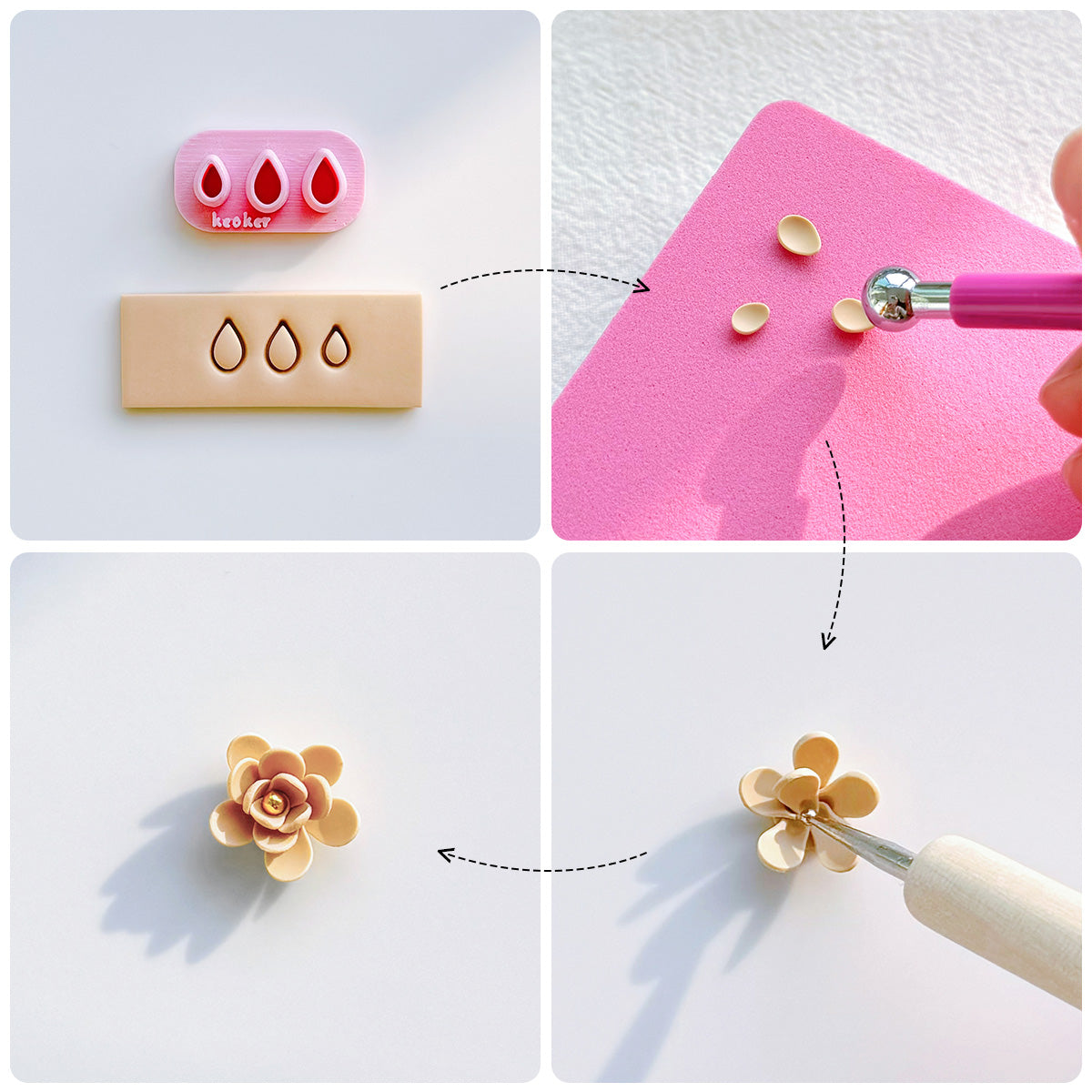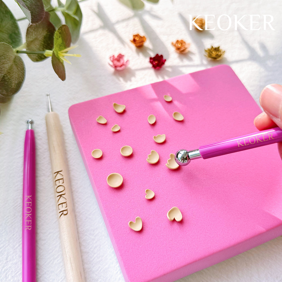 Keoker flower petal clay cutters kit come with 6 shapes tiny flower petal cutters, 2 metal ball tools, dotting pen tools, magic petal pad.
