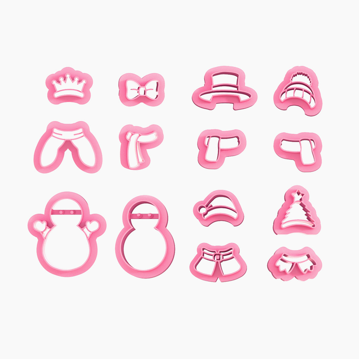 2/ Multiple Accessory Polymer Clay Earring Cutters for Christmas: Includes decorative cutters — crown clay cutter, scarf clay cutter, cape clay cutter, bow clay cutter, Christmas hat clay cutter, and Christmas tree hat clay cutter — that can be freely combined with snowman shapes to create unique earrings or festive jewelry.
