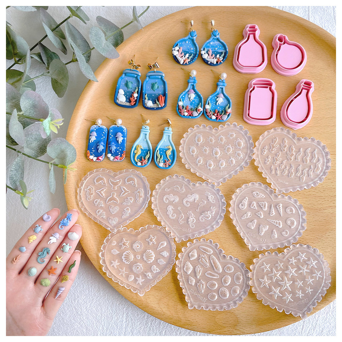 1/ Package Includes: Set of 8 silicone ocean clay molds and 4 shapes Glass bottles clay earing cutters, sea turtle clay molds, water grass clay molds, seahorse clay molds, starfish clay molds, shell clay molds, conch clay molds, seagrass clay molds, jellyfish polymer clay molds for earrings, marine polymer clay earring molds.